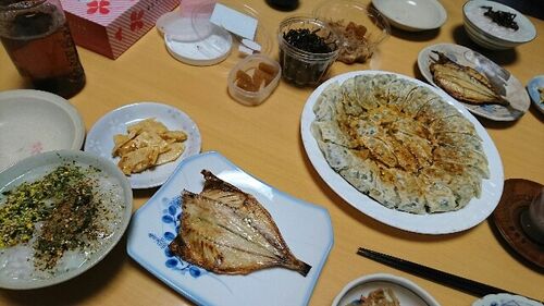 一日三食・巨匠付き! 魚料理って聞いてたけど、餃子!? 「納豆餃子」だそうです。 本日も、ウチの巨匠に感謝…
