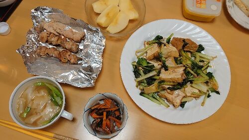 焼き鳥に、厚揚げの炒め物♪ あるもの、でね♪ 本日も、ウチの巨匠に感謝…