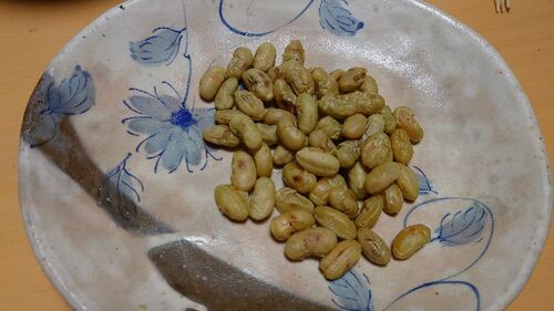 これ、大豆です。 一晩水に浸して、フライパンで炒ったんだそう。 これ、結構美味しいんですよ♪ 食感は、ちょっと柔らかくて。 大豆の甘みが出て、クセになりますよ! 巨匠、「年の数だけ、食べてみる」 僕は50ですか。 巨匠、言っておきながら、「7x個も、…